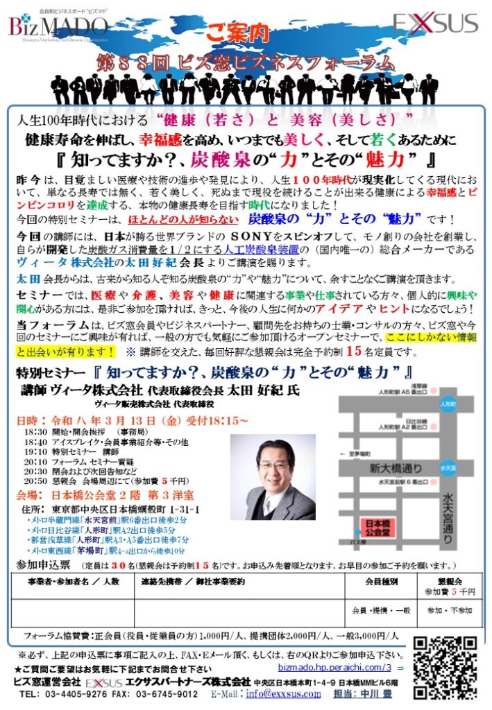 日本が誇る世界ブランドの SONYをスピンオフして、モノ創りの会社を創業し、自らが開発した炭酸ガス消費量を1/2にする人工炭酸泉装置の開発企業で(国内唯一の)総合炭酸泉メーカーであるヴィータ株式会社の太田好紀会長よりご講演を賜ります。